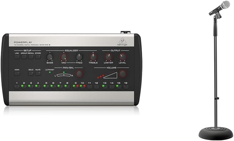 Behringer Powerplay P16-M 16-Channel Digital Personal Mixer The Behringer Powerplay P16 system is the easy, affordable way to give your musicians and vocalists what they really want - "more me." P16-M Personal Mixers lets each performer take control of what they hear, allowing the engineer to concentrate on providing the audience with the best possible listening experience. Fast and easy to set up, a basic system can be installed and configured in a matter of minutes - and the system can be expanded to adapt to changing needs. Tech-Free Zone. The P16-M's simple user interface makes it easy for even non-techies to dial-in the perfect monitor mix. For example, let's say the electric guitar is too loud in the lead vocalist's mix; they simply press the appropriate channel button (the one labeled E. GTR) and turn the Volume control to lower the guitar level in their mix. They can also adjust Pan (left to right mix), EQ (Bass, Mid with sweepable Freq control and Treble), and much more. All of these adjustments can be made without affecting anyone else's personal mix. Easy Installation A basic installation consists of one P16-I Input Module, which connects to the main mixing console, and up to six P16-M Personal Mixers, creating a system big enough to equip a typical recording studio, a small to medium-sized band, or a worship team. You'll also need a few standard audio and CAT5 cables. The optional P16- MB mounting bracket allows the P16-M Digital Personal Mixer to be attached to any standard microphone, music or drum stand. The system can easily be expanded via the P16-D Digital Ultranet Distributor, six of which can be combined to drive up to forty-eight P16-M Personal Mixers. Extraordinary Value. The Powerplay P16 puts total control of the monitor system where it belongs - in the hands of the performers, freeing up the engineer to sculpt the perfect front-of-house mix. The Powerplay P16 system is the easy, affordable way to tame runaway stage volume and give your musicians and vocalists what they really want - "more me." PYLE-PRO Microphone Stand - Universal Mic Mount with Heavy Compact Base, Height Adjustable (2.8’ - 5’ ft.) - PMKS5 PylePro Model : PMKS5 Compact Base Microphone Stand Microphone Stand - Universal Mic Mount with Heavy Compact Base, Height Adjustable (2.8’ - 5’ ft.) Features: Lightweight & Compact Mic Stand Style Universal Handheld Microphone Compatibility Convenient Floor-Standing Mount Design Height Adjustable Tightening Clamp Pivot Angle Adjustable Microphone Clip Sturdy, Metal Stand Base Disassembles for Easy Storage / Transport Perfect for Home, Office or Studio Use Some Assembly Required What’s in the Box: Adjustable Mount Arm Microphone Clip Stand Base Technical Specs: Microphone Clip U.S. Standard: M-6 Universal Screw-On Threading: Standard 5/8'' -inch Construction Materials: SteelAlloy Base + Mounting Pole Minimum Height: 2.8’ ft. Maximum Height: 5.0’ ft. Base Diameter: 9.8’’ -inches Die-Cast And Steel ConstructionSleek Black FinishUltra-Light For Easy TransportMIC Holder IncludedHeight Adjustment From 33.5" to 60.24''Length Of Boom: 33.46''Weight: 9.92lbs.