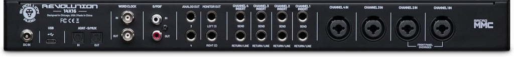 The Revolution 14x16 plays well with others. You get four mic/instrument preamps; channels 1 and 2 can be accessed from either the front or back of the unit. You also get 4 switchable insert/returns for connection to external hardware processors; you can A/B your signal at the touch of a button. The Return connections double as Line inputs for keyboards, synths, and other line-level devices. You can even use the Revolution 14x16 as a standalone mic preamp with no computer connection, thanks to the Insert/Return connections.