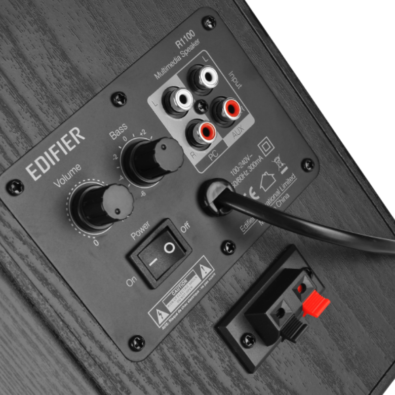 The R1100 has two available inputs for both PC and auxiliary ports. There are also two knobs located on the back of the active speaker used for controlling the sound. Adjust the volume and level of bass.