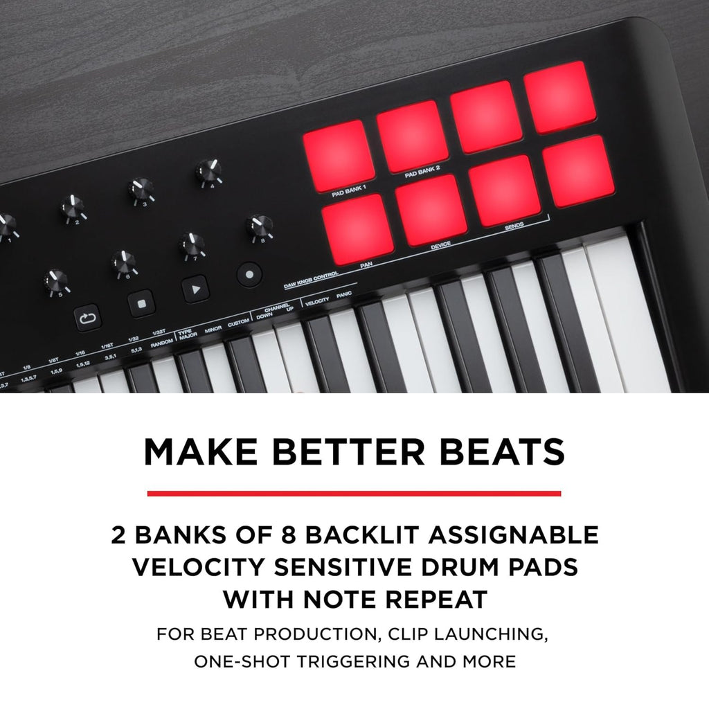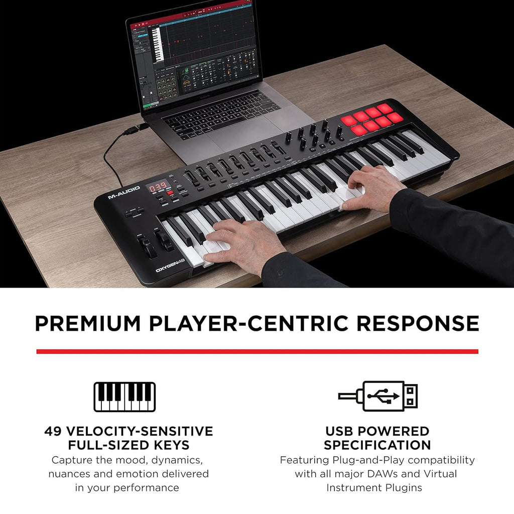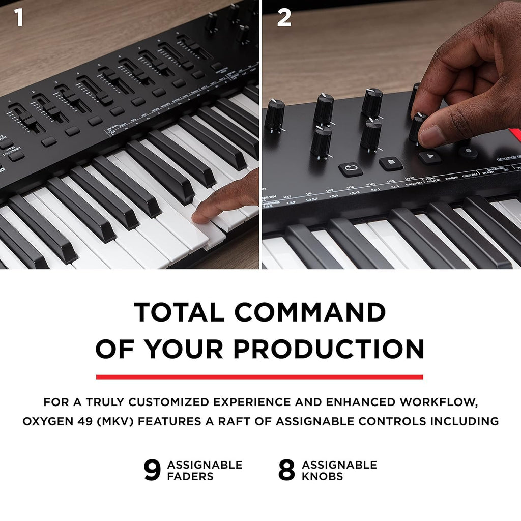 The Oxygen 49 MKV, in today’s world of music production, controlling your digital music environment is important. It is not only how the pros improve their workflow, but also how they create unique cutting-edge signature sounds. M-Audio has updated the most iconic series of MIDI keyboard controllers on the market for software-based music production and performance. The new Oxygen Series (MKV) keyboard controllers offer innovative advancements in hardware control enabling you to create modern cutting-edge music on stage or in the studio.