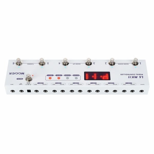 The L6 MKII offers two operating modes: Play mode allows previously stored sounds to be directly recalled from up to 36 preset slots (which are organised in six banks with six presets each) using the footswitches, while Live mode in turn enables the six footswitches to activate the corresponding effect loops. Live mode is the ideal choice whenever users want to adjust their guitar sound in the blink of an eye during a performance or flexibly experiment with multi-effects to create their own signature sound. The Mooer Pedal Controller L6 MKII delivers a consistently stable signal chain from guitar to amplifier thanks to its true bypass switching, which reliably routes the guitar signal only through activated effect loops and completely bypasses the inactive ones. The mute switch, which is located directly before the master output, allows the entire pedalboard to be muted for noise-free tuning breaks.