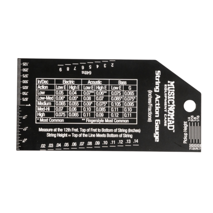 The Music Nomad MN602 Precision String Action Gauge gives players and techs a professional way to measure string height with total accuracy. Whether you're setting up an electric, acoustic, classical, or bass guitar, this gauge ensures you get your string action dialed in perfectly. It includes measurements in inches, millimeters, and 64ths, so you can customize your setup based on your preferred unit. A built-in chart displays recommended action ranges by instrument type, taking the guesswork out of the setup process. This tool is essential for achieving optimal tone, comfort, and performance.