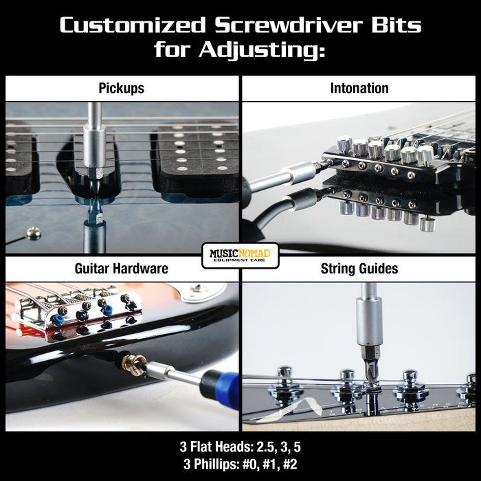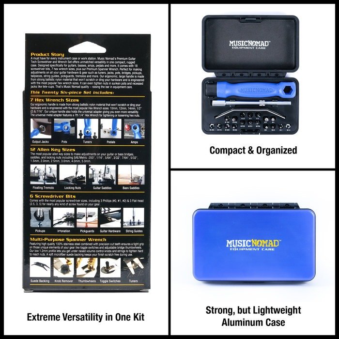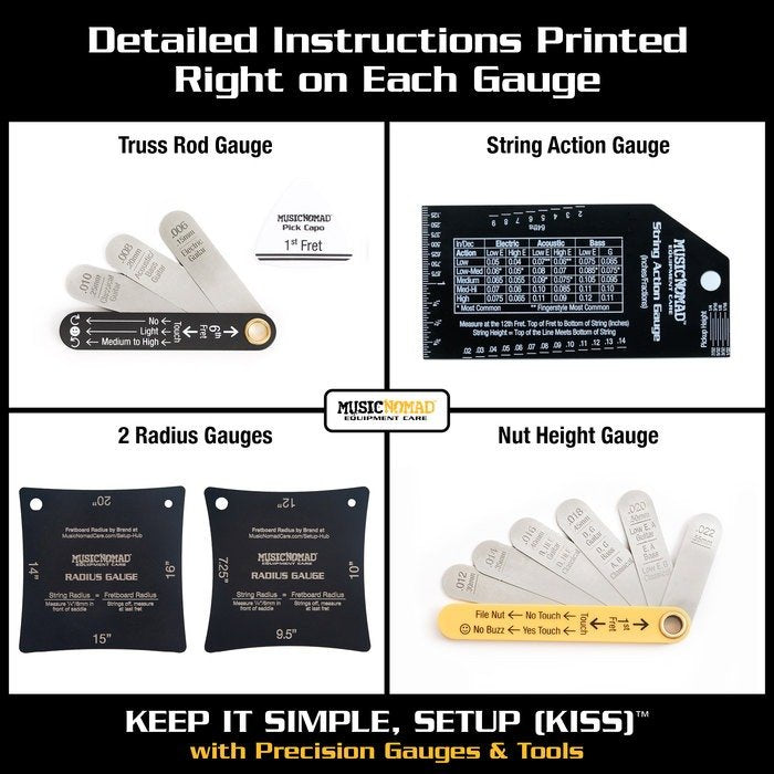 The Music Nomad MN609 KEEP IT SIMPLE, SETUP (KISS)™ Starter Kit is a 43-piece all-in-one bundle created for players who want their guitar to feel, play, and sound its best. Designed for both beginners and professionals, it includes a 6-piece precision gauge set, a 26-piece guitar tech screwdriver & wrench set, and an 11-piece truss rod wrench set. Whether you’re adjusting action, truss rods, hardware, or fretboard radius, this kit provides the right tools with detailed instructions. It’s your gateway to pro-level setups, combining top-quality materials, easy-to-use tools, and MusicNomad’s trusted KISS™ setup method.