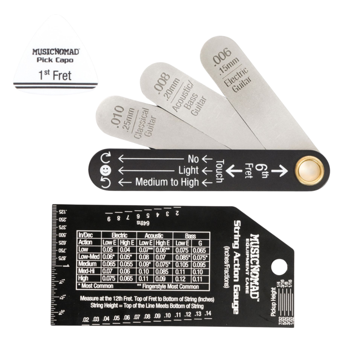 The Music Nomad MN614 Combo Bundle includes the two most used gauges in the setup process: the Truss Rod Neck Relief Gauge and the String Action Gauge. Whether you're adjusting an electric, acoustic, classical, or bass guitar, these tools simplify precise measurements and improve your instrument’s playability and tone. This combo is ideal for beginners and seasoned techs alike. As part of MusicNomad’s KEEP IT SIMPLE, SETUP (KISS)™ system, it helps you follow step-by-step setup instructions to make your guitar sound and feel like a pro setup—right at home or in the studio.