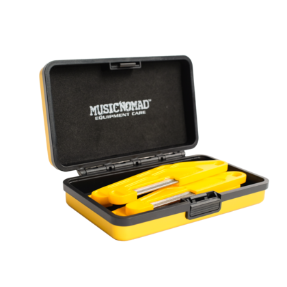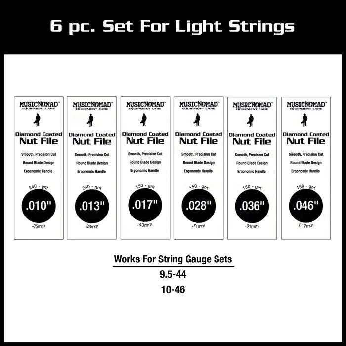 The Music Nomad MN668 Nut File Set is a game-changer for guitarists, luthiers, and techs. Designed for electric guitars with light strings (.010", .013", .017", .028", .036", .046"), this set offers unmatched precision for creating or adjusting nut slots. Unlike traditional toothed files that drift or snag, Music Nomad’s round, string-shaped blades ensure smooth and controlled cuts that match the natural contour of your strings. This design helps prevent overcutting and ensures cleaner contact for better intonation and tone. Whether you're replacing a nut or fine-tuning existing slots, these files deliver consistent, professional results.